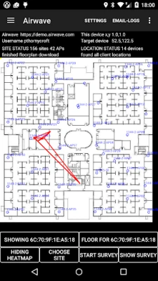 • An AirWave client that downloads the floorplan image and AP details from the network’s management system. See where APs are located relative to your position, and touch AP icons for details of current loading, channels and power. Also an estimated heatmap and a site survey function that links actual coverage measurements to locations on the floorplan.